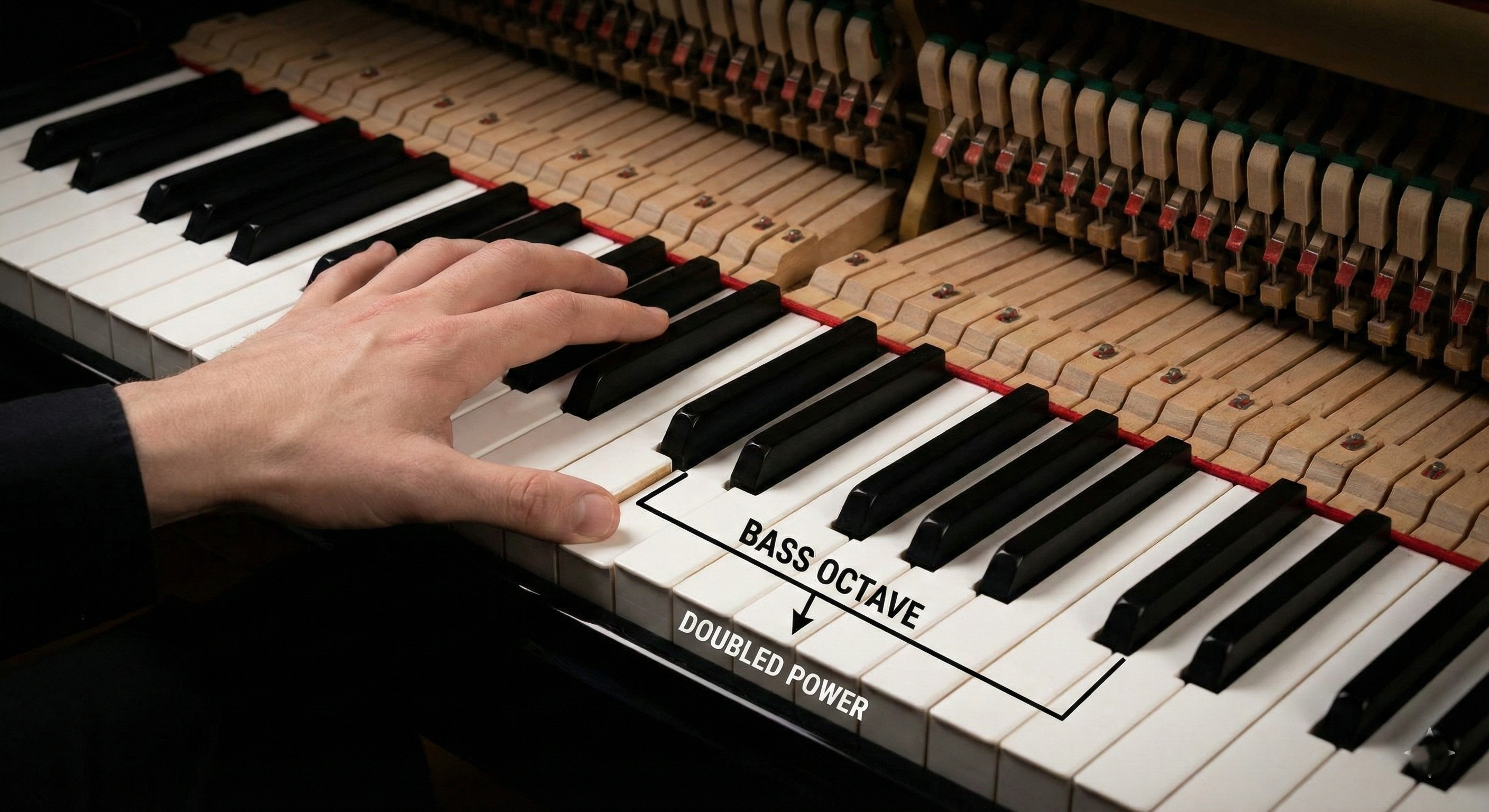 A single bass note rarely carries enough weight for an epic track. Whenever you encounter a strong bassline, play it in octaves, striking the same note simultaneously with your thumb and pinky. This instantly doubles the lower frequencies, simulating the power of cellos and double basses.