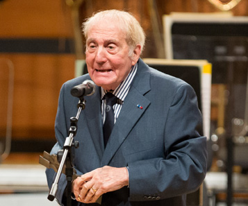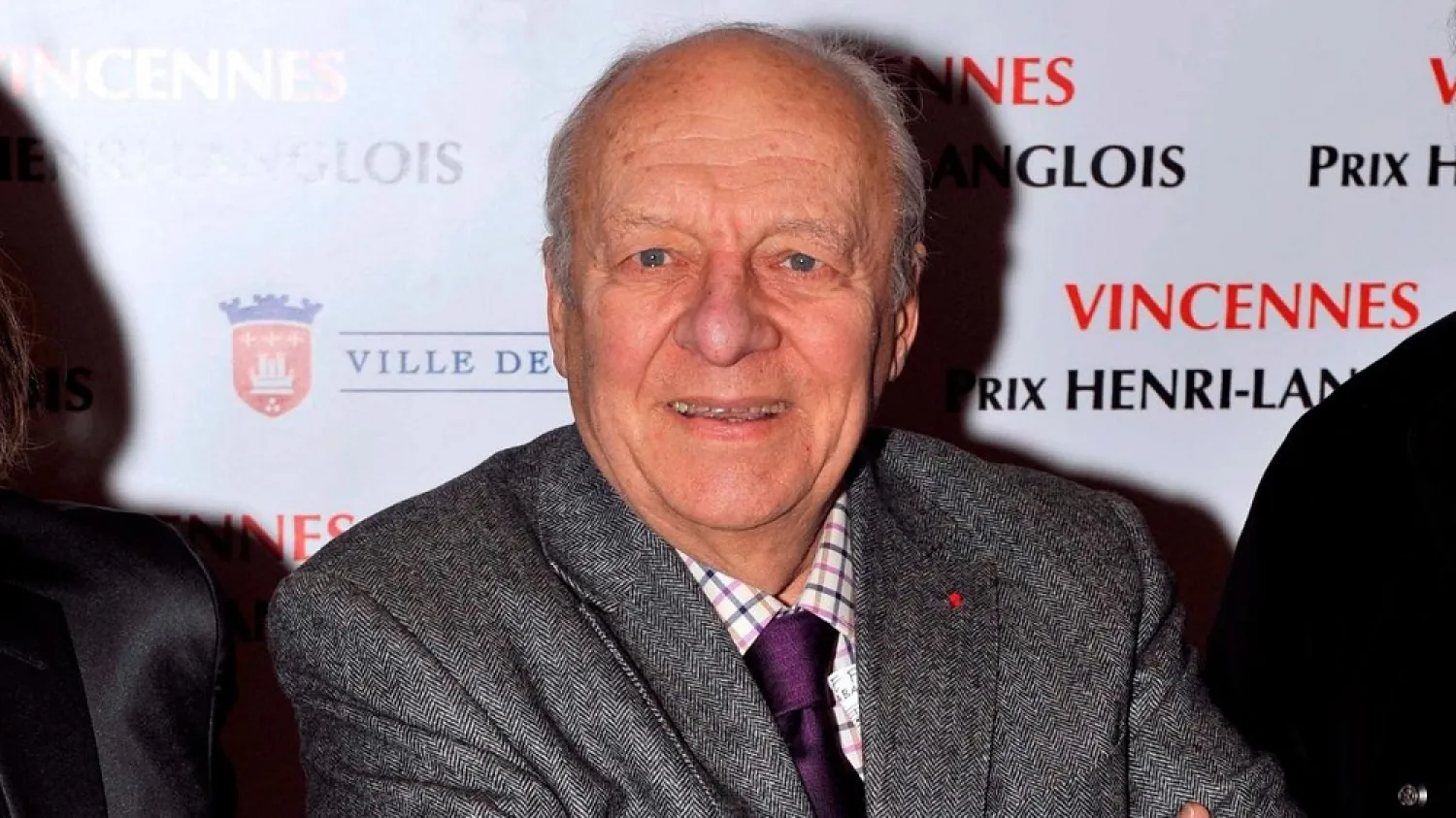Claude Bolling posing in front of a press wall featuring the Prix Henri-Langlois and Ville de Vincennes logos. Born in Cannes, Bolling was a jazz pianist, composer, and actor. He studied at the Nice Conservatory and began playing professionally at 14. Bolling's music contributed significantly to the jazz revival of the late 1960s.