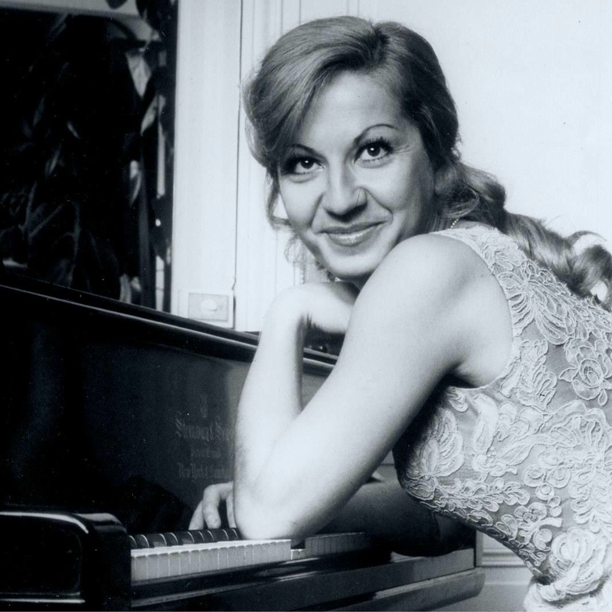 Cécile Ousset leaning on a grand piano and smiling. Cécile Ousset is a highly respected French pianist known for her powerful technique and disciplined interpretations. She developed an international career performing major classical repertoire, including works by Beethoven, Brahms, and Rachmaninoff, while maintaining a distinctly French sense of balance and control.
